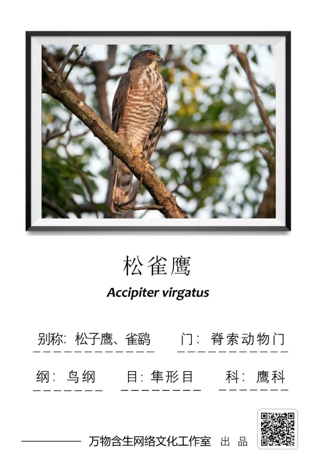 松雀鹰(Accipiter virgatus)为隼形目鹰科鹰属。其别名有松子鹰、摆胸、雀贼、雀鹞等,属于我国国家二级保护动物,列入《世界自然保护联盟》(IUCN) 2012年濒危物种红色名录——无危(LC)。