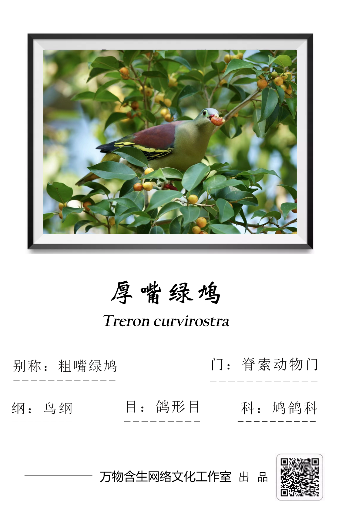 厚嘴绿鸠(Treron curvirostra):属鸟纲、鸠鸽科,别名为粗嘴绿鸠。该物种属于国家二级保护动物,被列入世界濒危鸟类名录N级和中国《国家重点保护野生动物名录》二级。