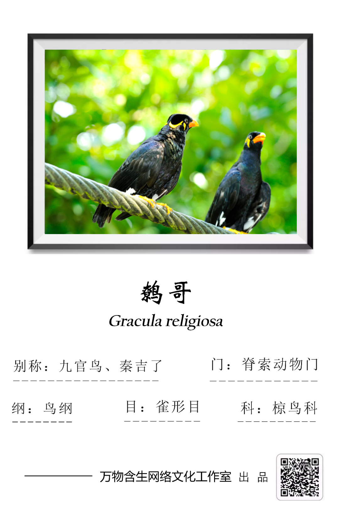 鹩哥(Gracula religiosa),雀形目椋鸟科鹩哥属,别名为九官鸟、秦吉了。该物种属于国家二级保护动物,被列入《世界自然保护联盟濒危物种红色名录》(IUCN)无危(LC)和中国《国家重点保护野生动物名录》二级。